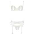 Pale and Pure. A delicate bra, thong and suspender belt ensemble of white net fabric combined with stretch satin and petite bows. Underwired bra with slitted cups and adjustable shoulder and suspender straps. Bra and suspender belt fabric. Stockings not included.