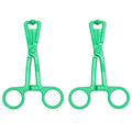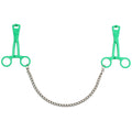 Green plastic scissor nipple clamps joined by 14 inch metal chain.