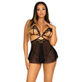 This daring two-piece open-cup babydoll lingerie set is the perfect way to spice things up and get some serious conversation going. The sheer mesh nightie features an open cup design with delicate eyelash lace detail, a strappy back, and a heart ring accent. The matching thong panties complete the look, while the sexy and seductive style is sure to get their attention. Be bold and show off your curves in this daring lingerie set and give them something to talk about. Package includes babydoll and matching panty Stretchy, breathable see-through lingerie fabric Open-cup lingerie top Strappy wrap-around back Wash by hand, do not bleach, drip dry, do not iron Babydoll 100% Polyester, Panty 100% Nylon