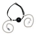 Leather strap ball gag with adjustable buckle for sizing. Attached to silver chained nipple clamps which can be removed.