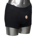 Black boxer brief harness, add your own dong or stimulator. Discreet 2 panel design to accommodate dual penetration Reinforced O ring stretches to accommodate most packers, dongs or probes Soft, stretchy and comfortable Comfortable soft lining Internal strap to secure your packer in place. Dildo not Included Internal pockets to add a favorite stimulator Not Included Washable 95 percent Cotton, 5 percent Spandex For women