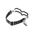 The mouth clamp is made of medical-grade stainless steel and the adjustable neckstrap is made of real leather.